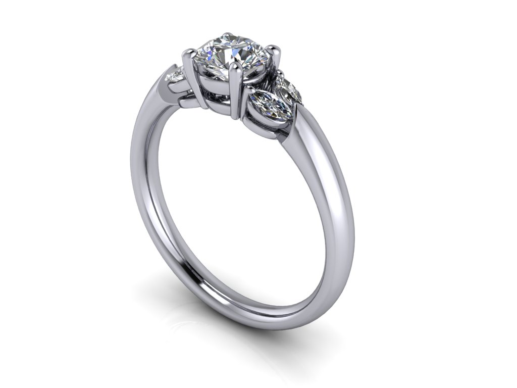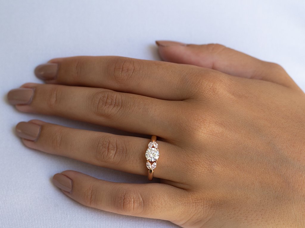 The CALLA engagement ring features a round diamond set in a four-pronged crown, which is adorned with two smaller marquise-cut diamonds on each side. The ring is very popular with women who prefer delicate jewellery. It is most often ordered in rose gold.