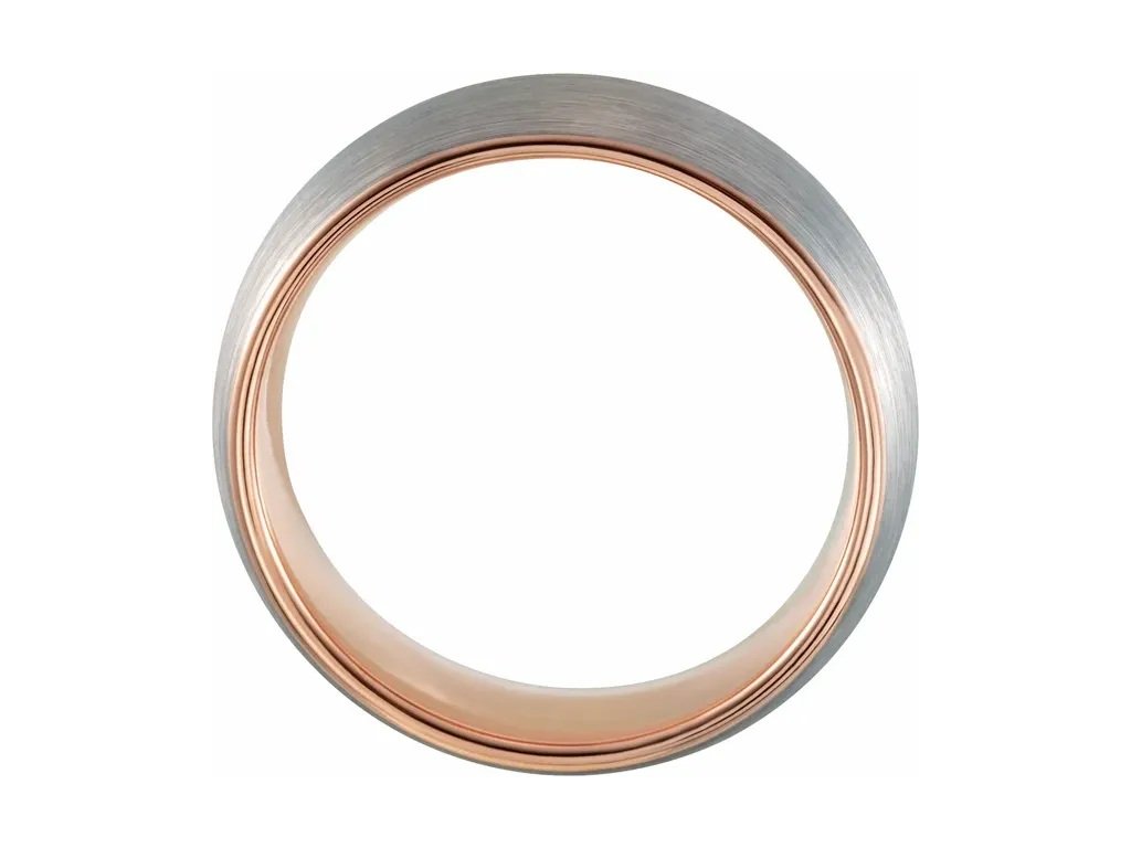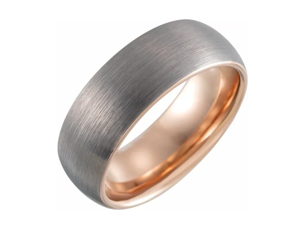 Elegantní matný pánský snubní prsten kombinuje šedou barvu wolframu a růžové 18kt zlato. Prsten JACK máme k vyzkoušení ve zlatnickém studiu v Karlíně. Prsten je možné vyrobit v šíři 6mm a 8 mm.